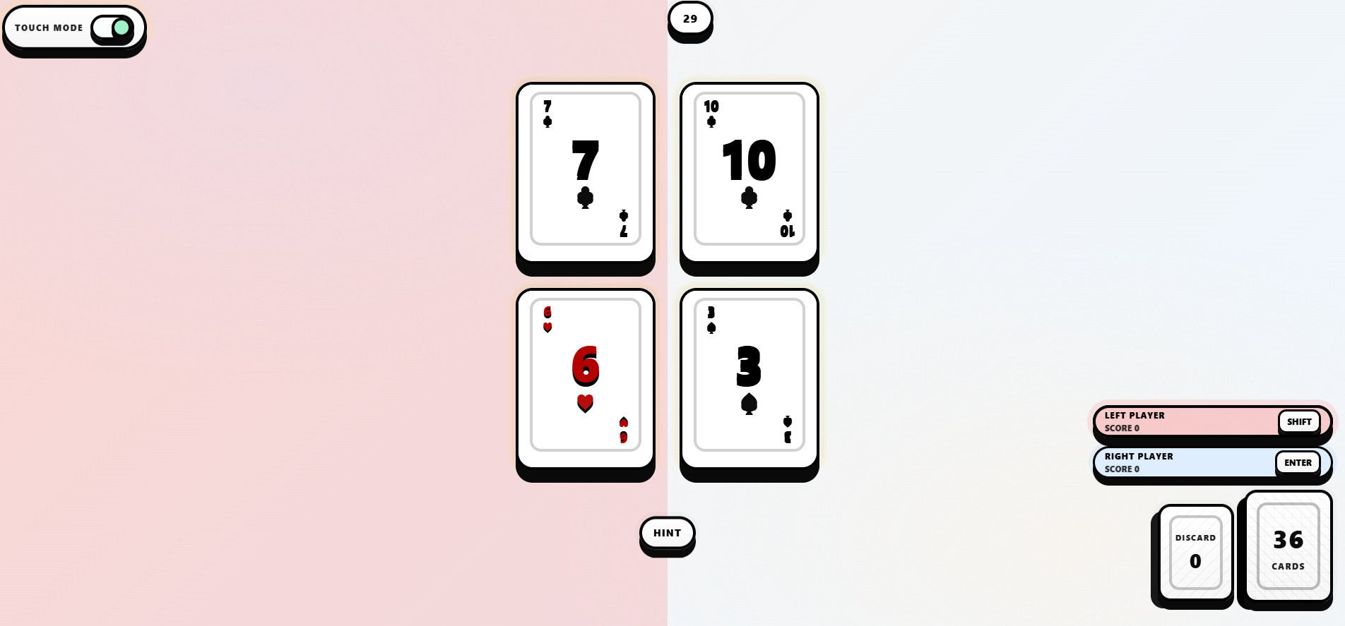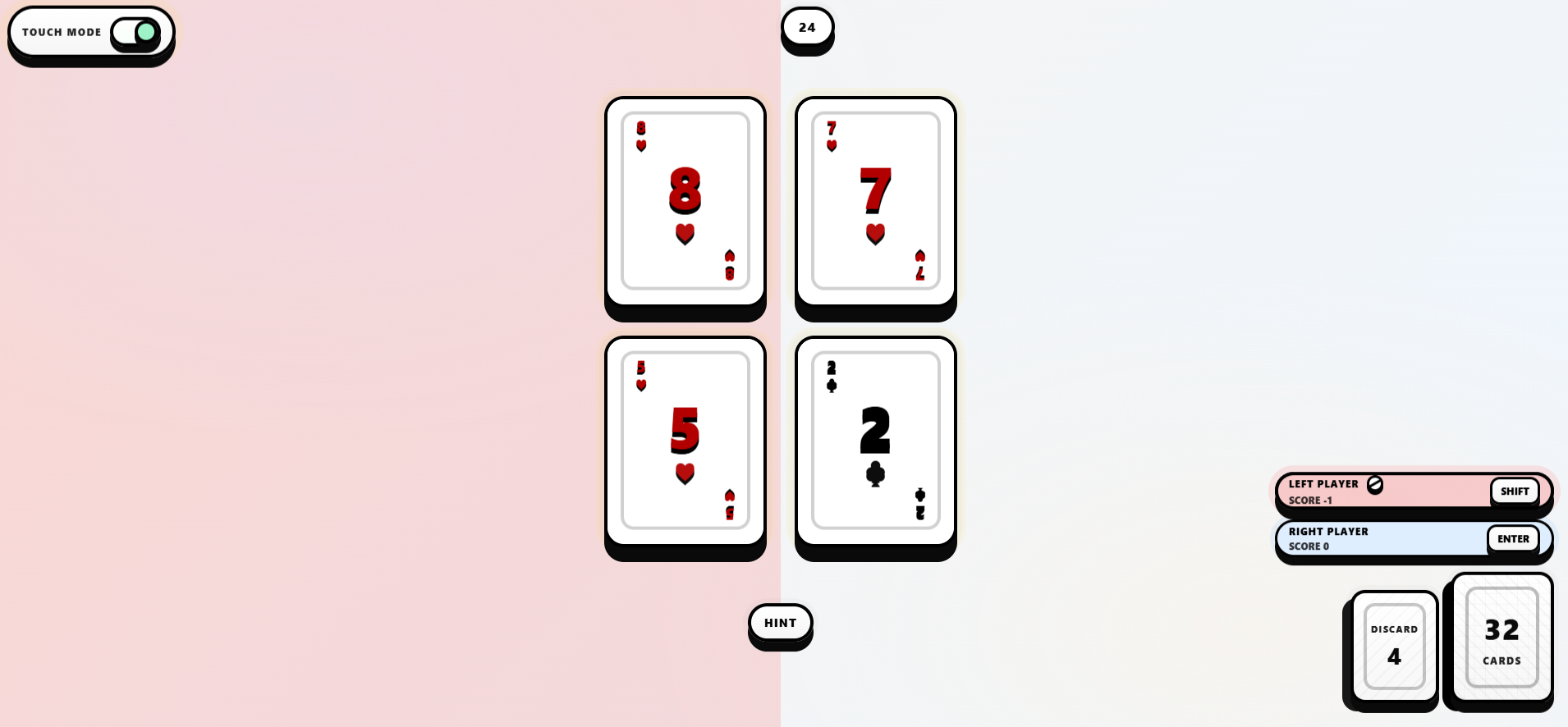 2 player game. Click shift and enter to start. 1 player on the left, 1 player on the right. if you are the left player and you know the answer you press shift and you must type in the equation to create 24 based on pedmas same for the right player but instead they press enter. first to get more points wins.